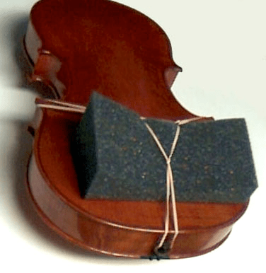 A foam rest is an inexpensive choice, and can be suitable for some (especially very young players). I do not prefer them because they often do not offer enough support, they can slide around instead of providing a secure violin posture, and the foam against the back of the violin can dampen the vibration of the wood somewhat. Still, they are the most practical choice for many beginning students, so here is one below. It is secured with rubber bands. The curved part fits over the player’s shoulder, while the thicker part rests on the collarbone area.