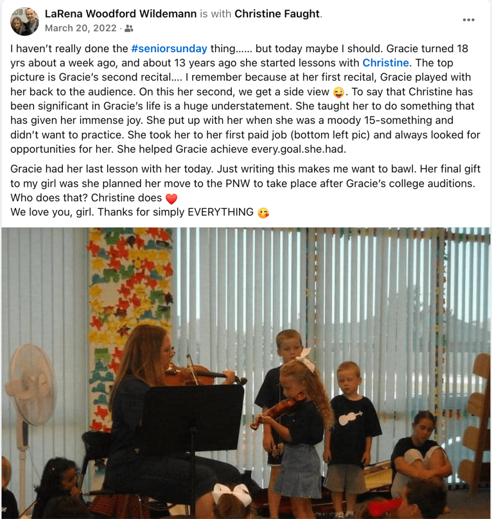 “Christine Faught was our son’s first group class violin teacher. This may not seem like anything momentous, but our son was only 3 years old and painfully reserved. Mrs. Faught lovingly nurtured him through this stage of his musical development, patiently including him in all activities even though there was significant discrepancy with that of the other students. The result was a beautiful blossoming of our son into a confident violinist who not only loved to play, but also loved attending group class. He couldn’t wait to go to group class and see Mrs. Faught. Between classes he would lovingly talk about how beautifully she played her violin. To put it lightly, he was star-struck. What our son was picking up on (which is perhaps Christine’s best trait, in my humble opinion) was that Christine Faught loves music. She loves to play, she loves to teach, she loves to be immersed in a musical environment…and she lovingly shares that with her students. We love Christine and can’t thank her enough for all she poured into our son.” – Lindsey H.